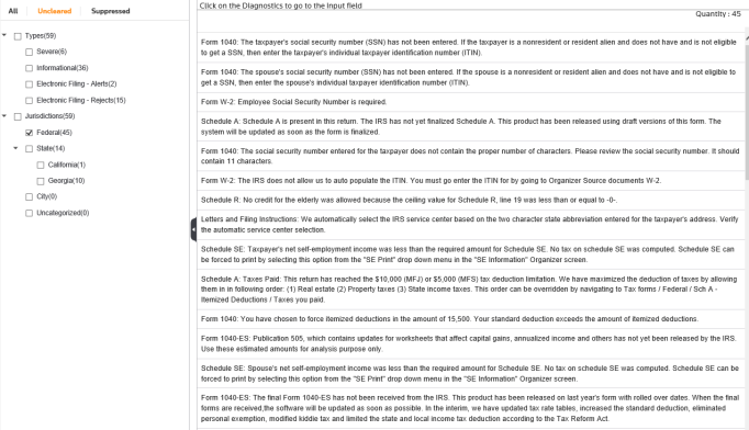 Preparers have the ability to “clear” or “suppress” diagnostics. However, all diagnostics will print. The “cleared” or “suppressed” diagnostics print with an asterisk “*” in front of the diagnostic. If you are printing diagnostics for a state, only that state’s diagnostics will print.