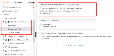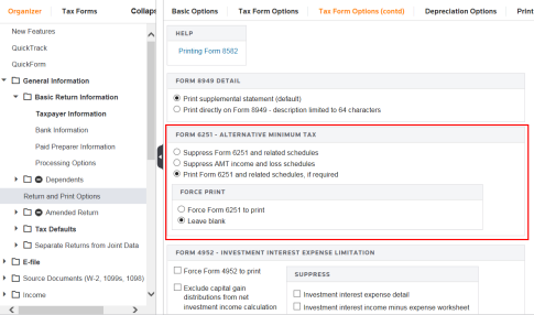 Form 6251 automatically prints unless you elect to suppress printing on the General Information > Return and Print Options > Tax Form Options (cont’d) tab. You can suppress the print of Form 6251 and related schedules, or just the income and loss schedules by selecting the appropriate option.