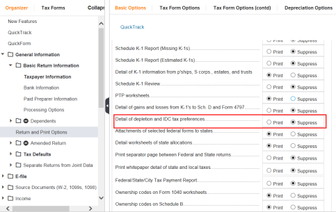 To print detail statements supporting the calculation of excess depletion and IDC tax preferences, click the Print radio button on the Basic Options tab of the General Information > Return and Print Options folder.