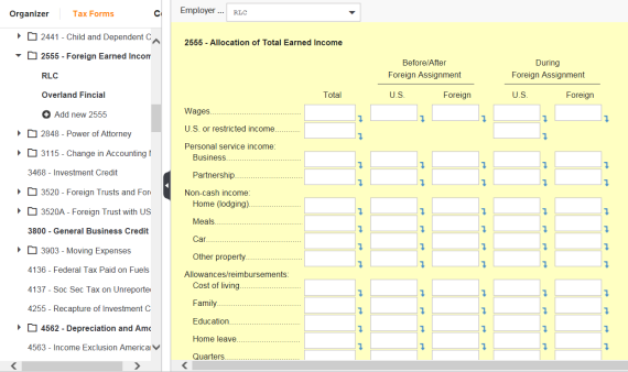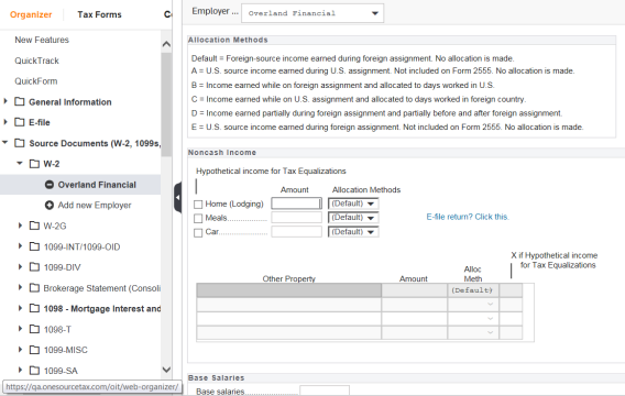 Enter base salaries and other foreign compensation. Selecting an allocation method determines how the income is divided between US and foreign assignments. Non-cash income is also entered on this organizer screen. You can allocate the part of each non-cash income item to the days worked in the US.