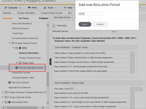 After inputting foreign compensation, the allocation of compensation can be reviewed in the printed return as well as in tax forms view at Tax Forms > Federal > 2555 – Foreign Earned Income > employer name > Page 2 tab. Drill down on line 19.