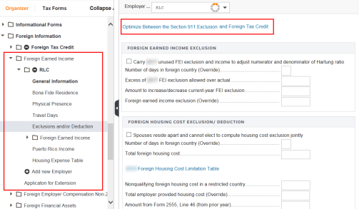 To optimize returns between §911 exclusion(s) and foreign tax credit, you must click the Optimize Between the Section 911 Exclusion and Foreign Tax Credit button (shown below) to select an optimization code on the Exclusions and/or Deduction screen. See Foreign Optimization.