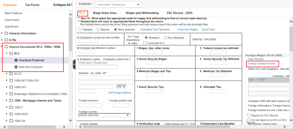 Go to Organizer > Source Documents > W-2 > employer name and elect the Foreign Earned Income hyperlink.