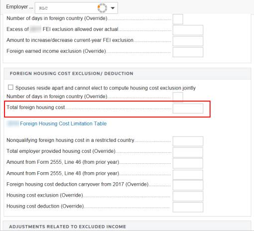 Scroll down the Exclusion and/or Deduction screen to enter foreign housing costs.