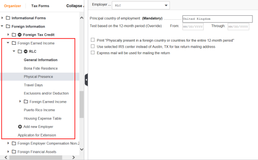 You can enter information for physical presence instead of bona fide residence on the Physical Presence screen. The tax application calculates the physical presence test.