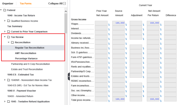 Access Tax Review Workpapers from the Tax Review folder under the Tax Forms tab. You can use Tax Review to pinpoint areas of concern and areas needing further investigation. Tax Review shows input/output, differences, and variances from prior-year amounts.