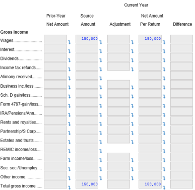 Notice each line of the tax return is listed. The prior-year net amounts are helpful in pointing out problems or omissions when compared against the current year amounts. The source amounts are the amounts you actually enter in the Organizer forms.