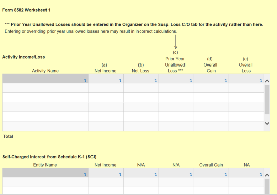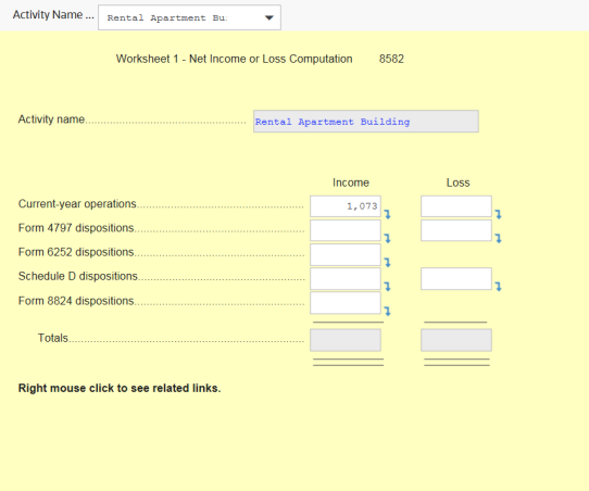 The workpapers show the activities and their net income, net loss, and prior year unallowed loss. You can select an amount field on the workpapers to hyperlink to the related Organizer screen.