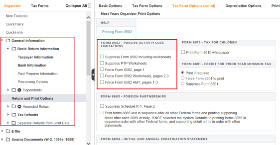 The system default is to print Form 8582 and all supporting worksheets. You can select to suppress Form 8582 and/or all worksheets in the General Information > Return and Print Options > Tax Form Options (cont’d) folder.