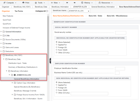 The Beneficiary Information folder contains sets of subfolders for each beneficiary. Select a tab in the General Beneficiary Information folder to enter individual beneficiary information and distributions.