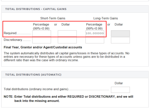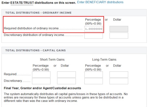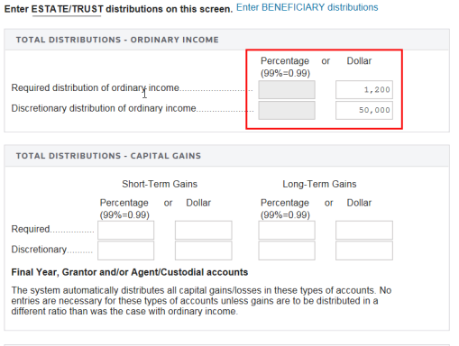 The amounts or percentages entered on the Distributions-Totals screen are the totals for the entire trust and refer to the distribution of Distributable Net Income (DNI) exclusive of capital gains. In the percentage fields, enter 100 for 100%; 1.0 will be computing as 1%.