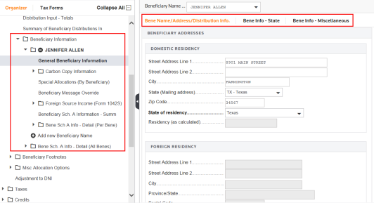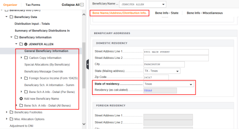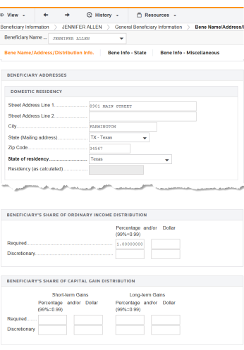 On the Bene Name/Address/Distribution Info tab, choose the state of residence for each beneficiary. If no resident state is selected, the system default is to use the same resident state as the fiduciary.
