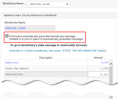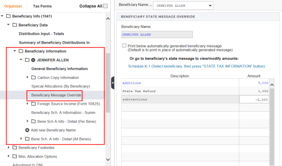 You can use the system-generated beneficiary message or create your own customized message for each beneficiary. To customize your message, select the Beneficiary Message Override screen from the Beneficiary Info (1041) > Beneficiary Data > Beneficiary Information folder.