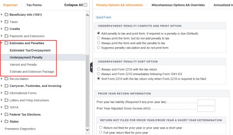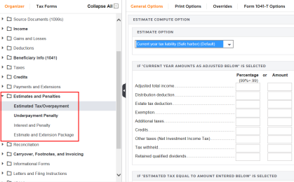 Use the Estimates and Penalties folder to select your compute and print options for estimates and underpayment/late filing penalties on a return-by-return basis. These options may also be set up in Tax Defaults.