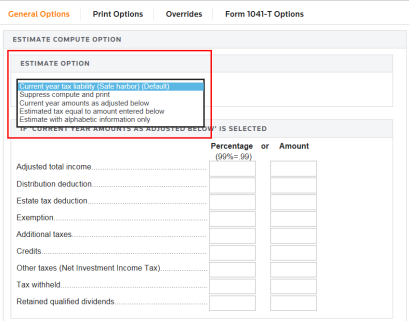 Choose the option for the computation of estimated tax on the Compute Option tab. An override for the estimated tax amount can also be entered here. Use the tabs to select additional options for estimates and penalties.