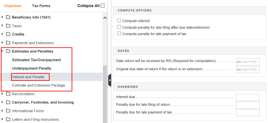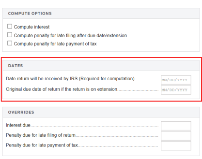 If the return is being filed late, it may need interest and penalties computed. On the Interest and Penalty screen, select the interest and/or penalties to be computed.