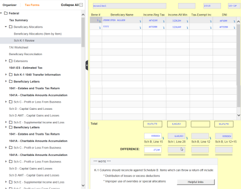 K-1 Review produces a schedule used to tie amounts distributed on Schedule K-1 back to Schedule B. From Schedule K-1 in Tax Forms > Federal, select an income amount to access the K-1 Tax Review workpapers.