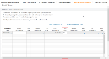 Click the Contributions/Distributions tab. Contributions/Distributions are allocated by beginning ratios unless specially allocated on this screen. Enter the date in the first column and the amount in the appropriate column. Enter a special allocation code, if necessary. To specially allocate an item differently than the ratios already set up in the partner information screen, enter a 2-character code in the Allocation Code field.