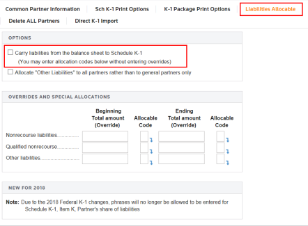 To carry liabilities from the balance sheet to Schedule K-1, select the check box under the Liabilities Allocable tab.