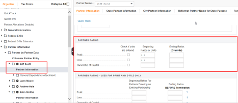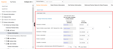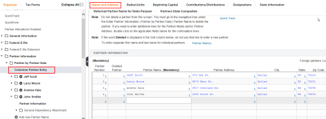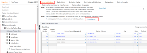 The Partner Information folder contains all of the information for the partners. Partner information can be bridged in, rolled over from a prior year’s return, or entered directly into the Organizer.