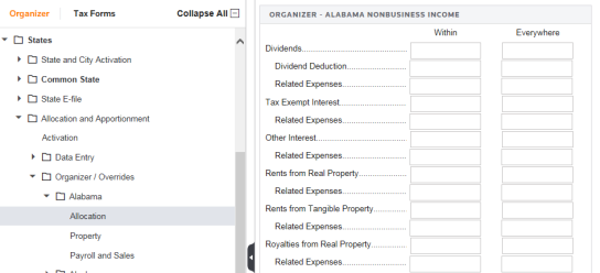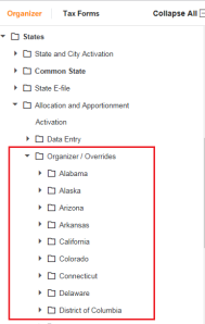 The Organizer/Overrides take your data entered here directly to the state tax returns. Your data flows to the state return without any automatic adjustment the tax application would normally make regarding state tax law requirements.