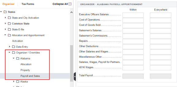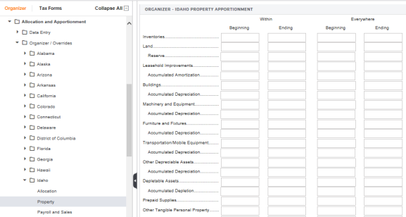 The information entered here flows to the A&A Detail tax forms and calculates for the state tax forms. Anything you enter on these organizers flows directly to a line on the state tax return.