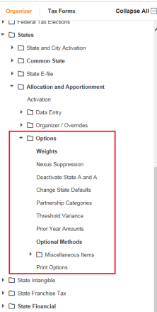 Each state in the 1120 A&A Organizer/Organizer forms list window includes a list of factors available for data entry. The items listed vary state to state. You can use these Organizer folders to enter A&A overrides and detail for certain items.