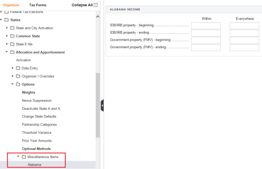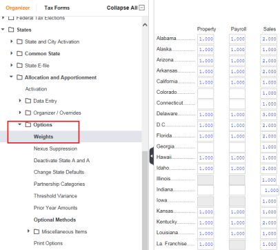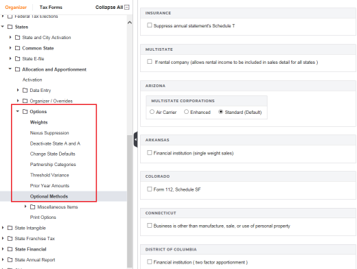 The Optional Methods Organizer is a central place to view any states that have different methods of computing the apportionment factor based on certain qualifications. You can scroll down through all the state options.