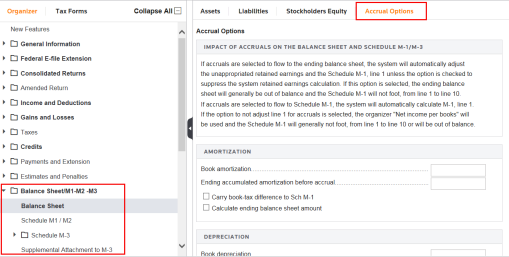The 1120 tax application provides many options to customize how the system handles your accruals. Review these options and make your selections on the Accrual Options tab in the Balance Sheet/M1-M2-M3 > Balance Sheet folder.