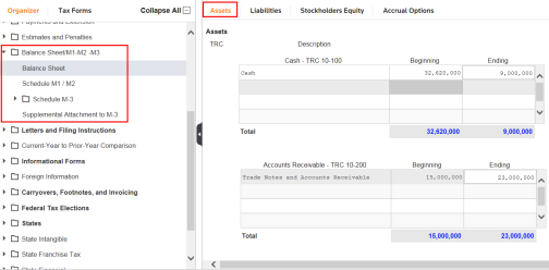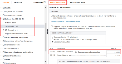 Select the Schedule M1/M2 folder to enter your Schedule M-1 and retained earnings information. Review and select the applicable Schedules M-1 options on the Reconciliation (M-1) tab.