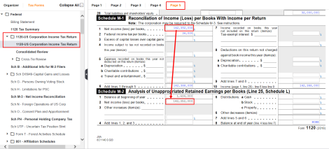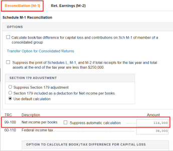 To balance the return, we compute Net income per books shown below on Schedule M-1 and carry this amount to Net income per books shown on Schedule M-2. The system automatically computes the net income per books amount if the option to compute retained earnings or use accruals is selected.