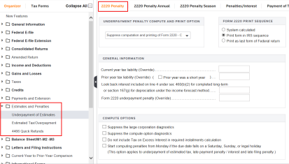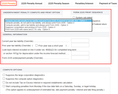 On the Estimates and Penalties > Underpayment of Estimates > 2220 Penalty screen, you may select various options for the computation of Form 2220. The system default is to compute and print Form 2220 if it is applicable in the return.