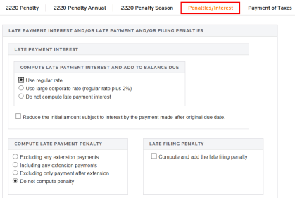 If payments were made late or the return is being filed late, it may need interest and penalties computed. On the Estimates and Penalties > Underpayment of Estimates > Penalties/Interest screen, select the interest and/or penalties to be computed.