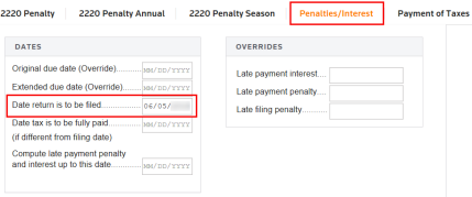 After you select the interest/penalties to be computed, you MUST enter the Date return is to be filed on the Penalties/Interest tab in the Estimates and Penalties > Underpayment of Estimates folder.