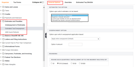 Choose the options for the computation of estimated tax and the application of the overpayment (if applicable). These options are found in the Estimates and Penalties > Estimated Tax folder.