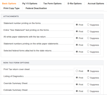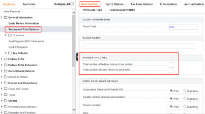 Use General Information > Return and Print Options > Basic Options to control factors such as the Number of copies, which forms/schedules print, what optional information prints on forms and attached statements, and which detail statements are generated.