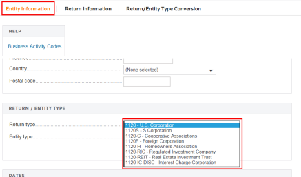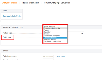 Under the Entity Information tab, scroll down the to select the Return and Entity Type for the company, the business Dates of Incorporation, and the Business Activity Code information.