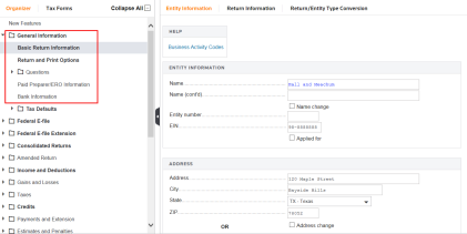 Use the General Information folder to enter company information. Select your return and print options, and answer basic return questions in this area.