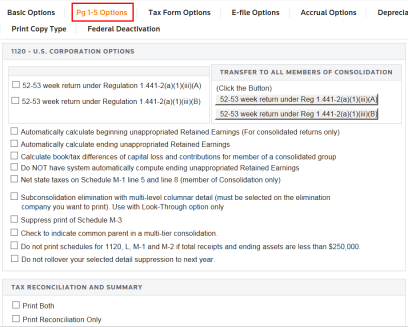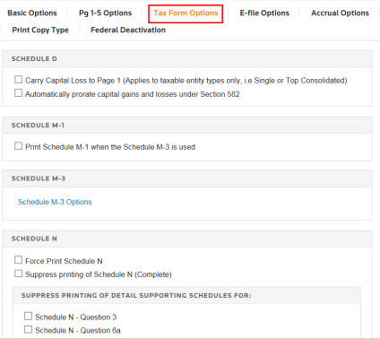 For form- or schedule-specific options, select the Pg 1-5 Options or Tax Form Options tab. Selections on these screens pertain to the computation and/or print of specific forms.