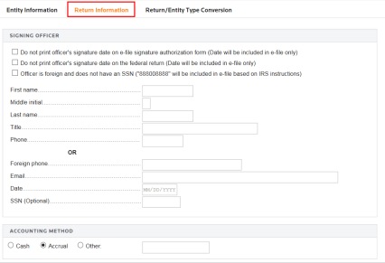Click the Return Information tab to select fiscal dates, accounting method, and special filing information.