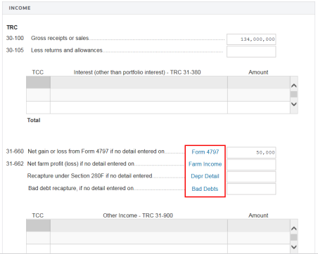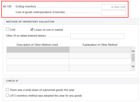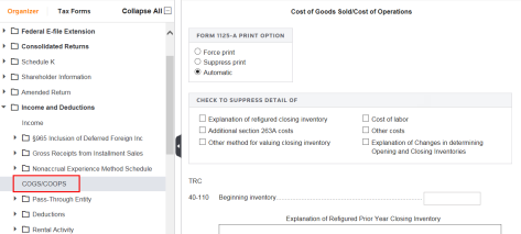 Use the COGS/COOPS screen to enter Cost of goods sold/operations data. The system uses depreciation and amortization data entered elsewhere in the return unless you make overriding entries here.