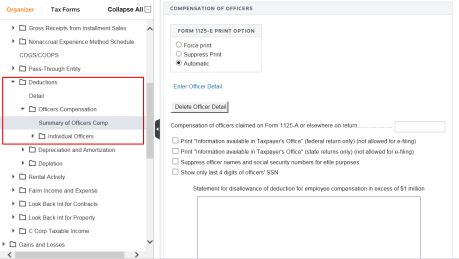 Use the Income and Deductions > Deductions > Officers’ Compensation screens to enter officer information and percent of time devoted to business.