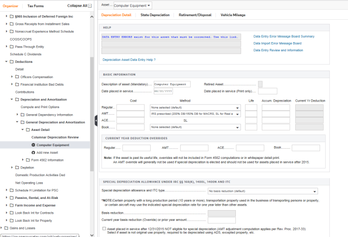 Each activity has a Depreciation and Amortization folder used to tie assets and related depreciation information to the selected activity. For more information on entering depreciation, review the Depreciation tutorial.