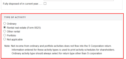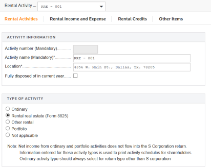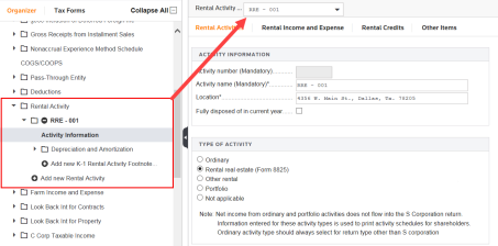 Scroll down the Rental Activities tab to select the Type of Activity. Click the applicable tabs to enter income and expenses and other information for this activity.