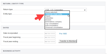 You must also select the appropriate Return/Entity Type for each return in the consolidation.