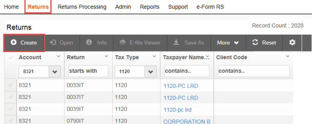 Create any needed new returns. Select Returns from the top menu, and then select Create. This opens the screen to create new returns.