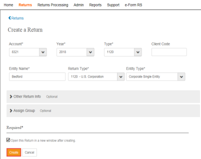 On the Create a Return screen, enter the Account*, Year*, Type*, and Client Code. Then enter the Entity Name*, Return Type*, and Entity Type*. Items marked with an asterisk are required. Select the check box to Open this Return in a new window after creating. Click the Create button.