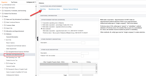 Enter Allocation and Apportionment information under each individual state by clicking the Data Entry link. Review the Allocation and Apportionment tutorial for more information on this process.