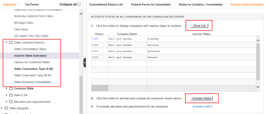 Return to Step 1 - What to Consolidate, and click the Inactive State Activation tab or click the State Combined Returns > Inactive State Activation item in the menu. First click the Show List button. This action displays a list showing the states, which have not been activated.