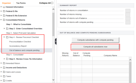 Next, go to Organizer > Step 4 - Review Preconsol Checklist > Out of balance and compute pending folder. Click the Compute all subsidiaries now button. Use this list to identity and correct any subsidiary locators that are out of balance.